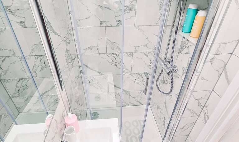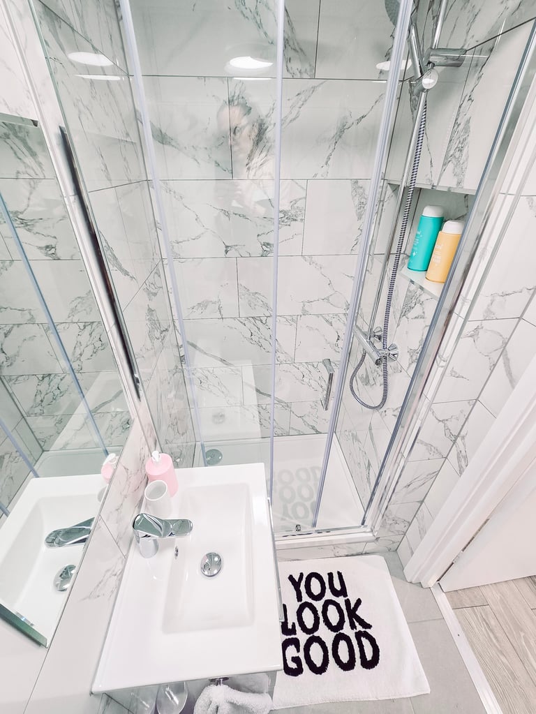 ✅ Private bathroom with marble tiles and fresh towels